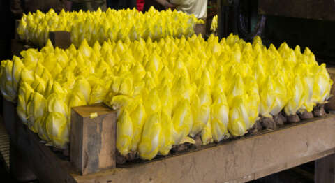 Chicorée wächst nicht wie andere Salate auf dem Feld. Er gehört zur Art Gemeine Wegwarte. Chicorée bildet eine längliche Rübe und eine Knospe, die auf dem Boden aufliegt. Bei der Rübe handelt es sich auch um die sogenannte Zichorien-Wurzel, die seit hunderten Jahren Hauptbestandteil von Malz- und Zichorienkaffee ist. Sie wird im Frühjahr eingepflanzt und im Herbst gerodet. In absoluter Dunkelheit wachsen dann daraus in angemessen temperierten Räumen die Chicorée Knospen. So behält er seine helle Färbung und einen leicht herben Geschmack. Licht und Wärme hingegen sorgen dafür, dass der Chicorée sehr bitter und ungenießbar wird.