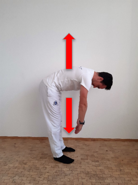 Beugen Sie Ihren Oberköper aus dem Stand nach vorne. Beginnen Sie mit der Beugung in der Hals-, danach mit der Brust- und am Ende mit der Lendenwirbelsäule. Versuchen Sie am Ende der Bewegung bei gestreckten Knien mit den Fingerspitzen möglichst weit zum Boden zu kommen. Strecken Sie anschließend Ihren Oberkörper wieder zurück in den Stand. Beginnen Sie mit der Streckung im Lenden-, danach im Brust- und am Ende im Halswirbelsäulenbereich. Wiederholen Sie die Übung 10 – 15 mal.