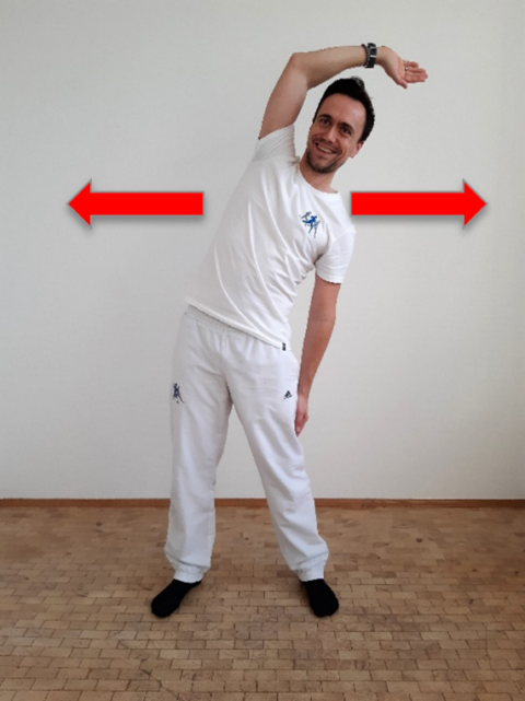 Neigen Sie Ihren Oberkörper unter Mitbewegung der Arme abwechselnd von links nach rechts. Achten Sie darauf, dass beide Füße am Boden fixiert bleiben. Wiederholen Sie die Übung 10 – 15 mal.