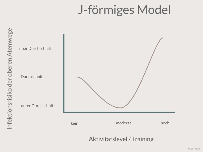 Körperliche Aktivitäten setzen demnach unseren gesamten Organismus unter zeitlich begrenzten Stress, der auch für das Immunsystem einen Trainingsreiz darstellt. Die Beziehung zueinander ist J-förmig (siehe Abb.). Dies bedeutet, dass z.B. das Infektionsrisiko der oberen Atemwege anfänglich mit steigendem Aktivitätslevel sinkt, ab einer bestimmten, individuell unterschiedlichen Schwelle mit höheren Trainingsumfängen und steigender Intensität aber wieder ansteigt. Sportlich hochintensive Belastungen wirken sich demnach tendenziell negativ auf unser Immunsystem aus, während Belastungen mit mittleren Intensitäten eher zu positiven Anpassungen führen.