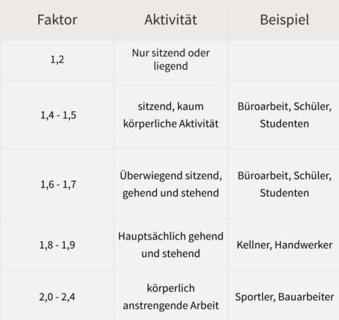 Um den Arbeitsumsatz zu errechnen, wird der PAL-Wert (Personal Activity-Life) benötigt: